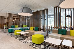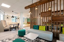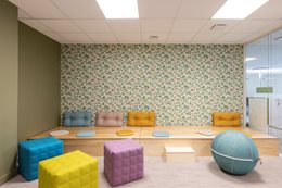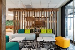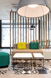Farebná schéma - Každé poschodie má svoju vlastnú farbu - od najchladnejších na prízemí po najteplejšie na šiestom podlaží - a horné poschodie s "klubovým" priestorom poskytuje množstvo výklenkov na sedenie a obsahuje všetky farby objektu. "Táto farebná schéma je jednotiacim faktorom v celom projekte a vytvára príjemnú harmóniu v interiéri. Úmyselne som sa vyhrala s triezvymi priestormi, ktoré sa nakoniec stali rámcom pre nábytok," hovorí Annie Vitipon, architektka projektu.