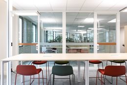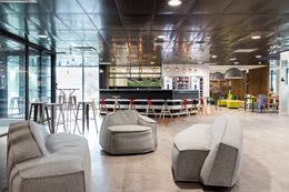 This area, regarded as the 'plaza, is the heart of the development. This atrium is a real meeting point and a place for dialogue, but is also the building's reception area, the access point to the garden and terrace and the place that connects the two wings of the construction.