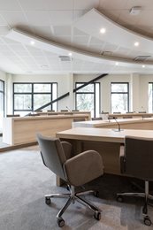 This part of the construction has been completely covered in metal netting, which appears to decorate it with a sheet of steel lace. The large bay windows also reinforce the omnipresence of nature. The architect decided to stress this presence through an interplay of patterns on the carpets, which evokes the mineral matter in the garden. The fact that this building is located inside a natural park is also highlighted by the use of various wood types on the internal structures and fittings, and by the choice of botanical tones for the furniture.