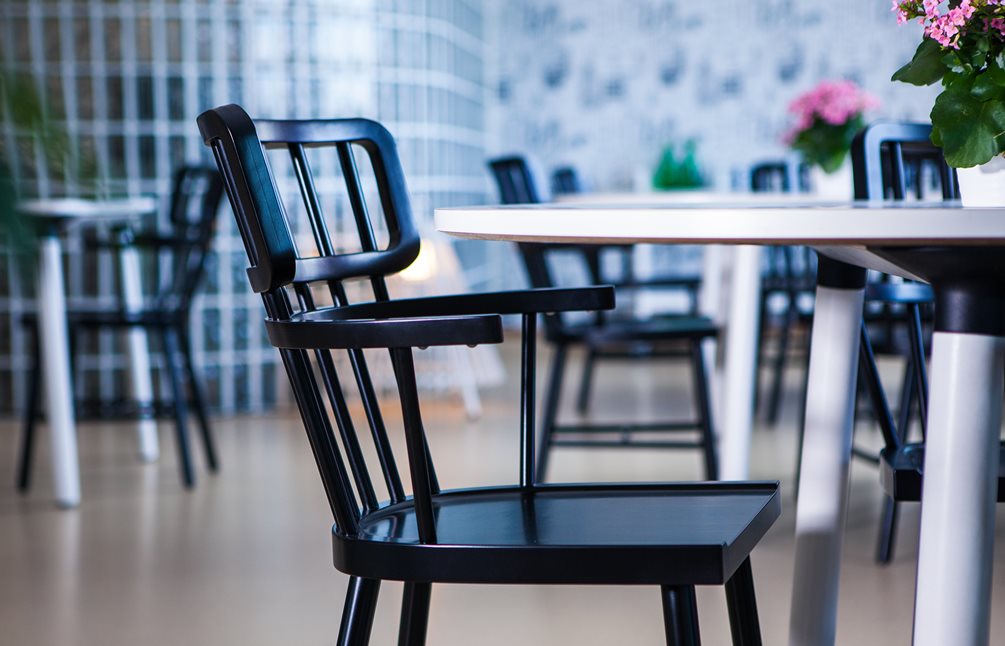 Dining room furnished with Björn chairs and Knop tables. Customised to maintain a pleasant level of acoustics while offering inviting furniture.
