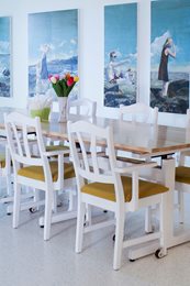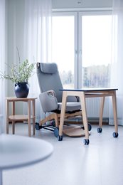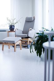 The communal areas have been furnished according to the same principles. All day rooms have wide French doors opening out onto large terraces and balconies. Even residents who are not able to go out on their own but still wish to feel the raindrops on their faces or the wind through their hair can be rolled out in bed. There is a shared dining area, kitchen and washing up room adjacent to the day rooms. The kitchen has been designed to function as an efficient work kitchen with a good working environment for the staff, but also as a large home kitchen. After all, it is the residents' kitchen! In each ward, there are generous spaces for socialising. All art, paint and materials in the wards have been selected in collaboration with staff representatives and the retirement organisations in Nyköping.