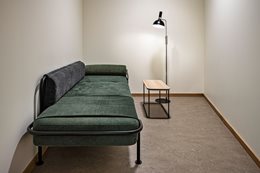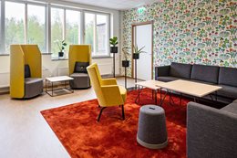 V interiéri je duch Estrid Ericson ešte zreteľnejší vďaka zaobleným organickým tvarom, klasickými potlačiam, nádherným farbám a materiálom príjemným na dotyk, nadčasovému štýlu a dizajnu interiéru, ktorý umožňuje meniť jeho funkcie. Jednoduché a elegantné, a zároveň príjemné riešenie plné farebnosti. Všetko je založené na súčasných poznatkoch výskumu, ktorý hovorí o tom, ako fyzické prostredie a spôsob, akým je navrhnuté, ovplyvňuje pohodu a výkon ľudí – v tomto prípade študentov a zamestnancov.