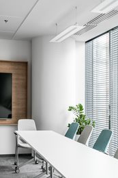 Navrhnutá v minimalistickom štýle, kancelária na vás zapôsobí svojou jednoduchosťou, tlmenými farbami a premyslenou funkčnosťou. Dominantnou farbou je biela, ktorá dodáva miestnostiam pocit ľahkosti a priestoru. Biela je vyvážená farbami prírodného dreva a sviežou zelenou farbou rastlín. Výber farieb a elegantných materiálov nie je náhoda - táto kombinácia pozitívne vplýva na pohodu zamestnancov a ich výkonnosť.