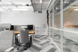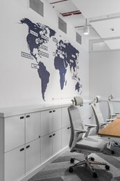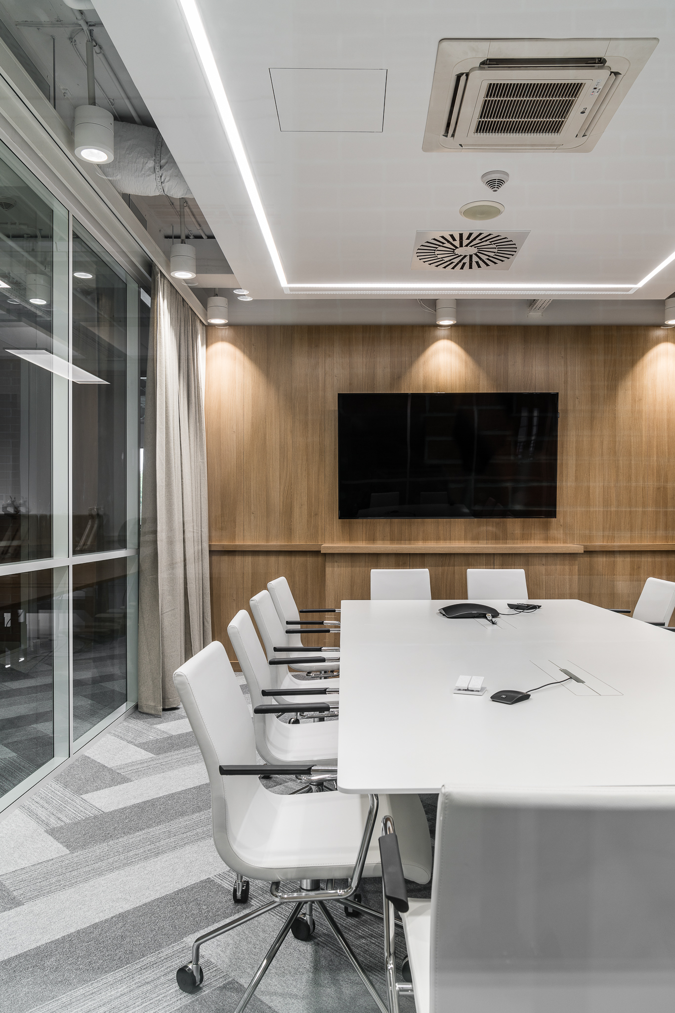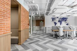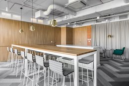 Ďalšia časť, o rozlohe 80 m², v sivých, zelených a tmavomodrých odtieňoch, bola usporiadaná trochu menej formálnym spôsobom. K dispozícii je veľký drevený stôl s barovými stoličkami - ideálnym miestom pre rozhovory o obchodoch alebo len na prestávku a priateľský rozhovor. Pohodlné sedacie súpravy, kresielka a pufy dotvárajú teplú, pokojnú atmosféru. V srdci každého domova je kuchyňa a ani táto kancelária nie je výnimkou. Centrálna zóna o ploche 70 m² zahŕňa kuchynku a chillout zónu, ako miesto pre stretnutia zamestnancov. Dlhý drevený stôl má svoje špeciálne miesto a je obklopený pohodlnými pohovkami, pufmi a pracovnými stolmi. Zamestnanci môžu tiež využiť dve konferenčné miestnosti v bielej farebnej schéme.