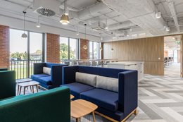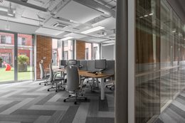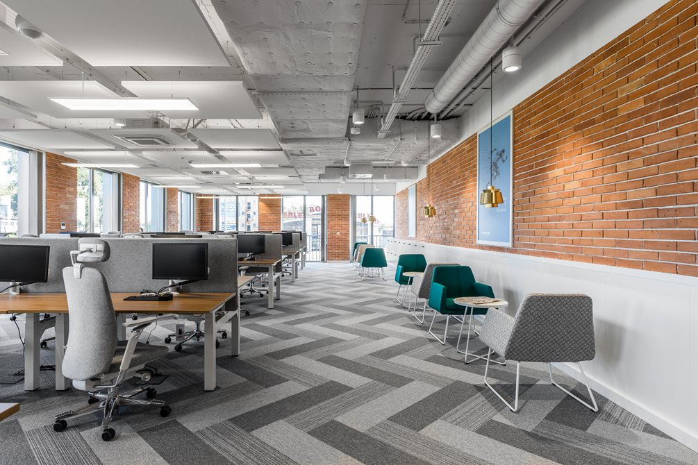 Krakovský hub tvorí 600 m2 moderného pracovného priestoru určeného pre prácu, ale aj pre relaxáciu. Otvorený priestor, okrem 70 typických pracovných staníc, zahŕňa útulné sedacie súpravy a kreslá, ktoré sú ideálne pre menej formálne stretnutia. Nekonvenčná zmes textúr, textílií a kobercov vytvára pôsobivé a osviežujúce prostredie. Sivé obloženia a otočné stoličky sa pekne spájajú s dubovými hnedými stolmi, bielymi nábytkovými rámami a s násetnnými panelmi z tehly. Zelené a sivé čalúnenie lounge kresielok zas dodáva prostrediu sofistikovanosť.