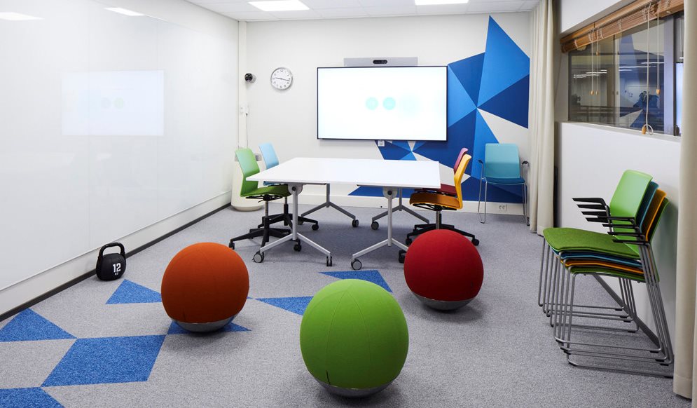 Priestory ponúkajú veľa rôznych možností. Taburety v tvare gule v miestnosti na oddych sa ukázali ako veľmi populárne medzi zamestnancami, rovnako ako pracovisko "zastavte sa na chvíľu" a stôl s bežiacim pásom.