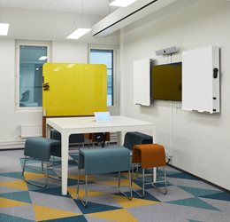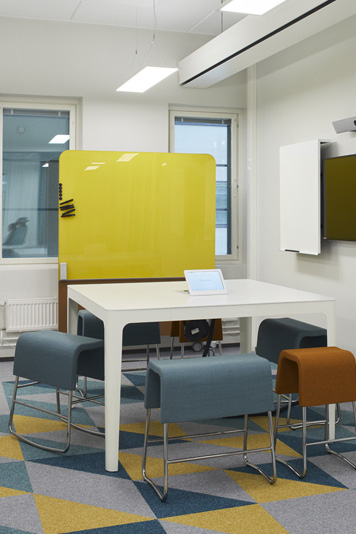 Priestor využíva prenosný viacúčelový stenový prvok s integrovanou písacou a magnetickou tabuľou, vyrobenou zo skla, a písaciu dosku, ktorá môže byť skrytá za paravánom.