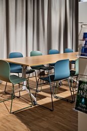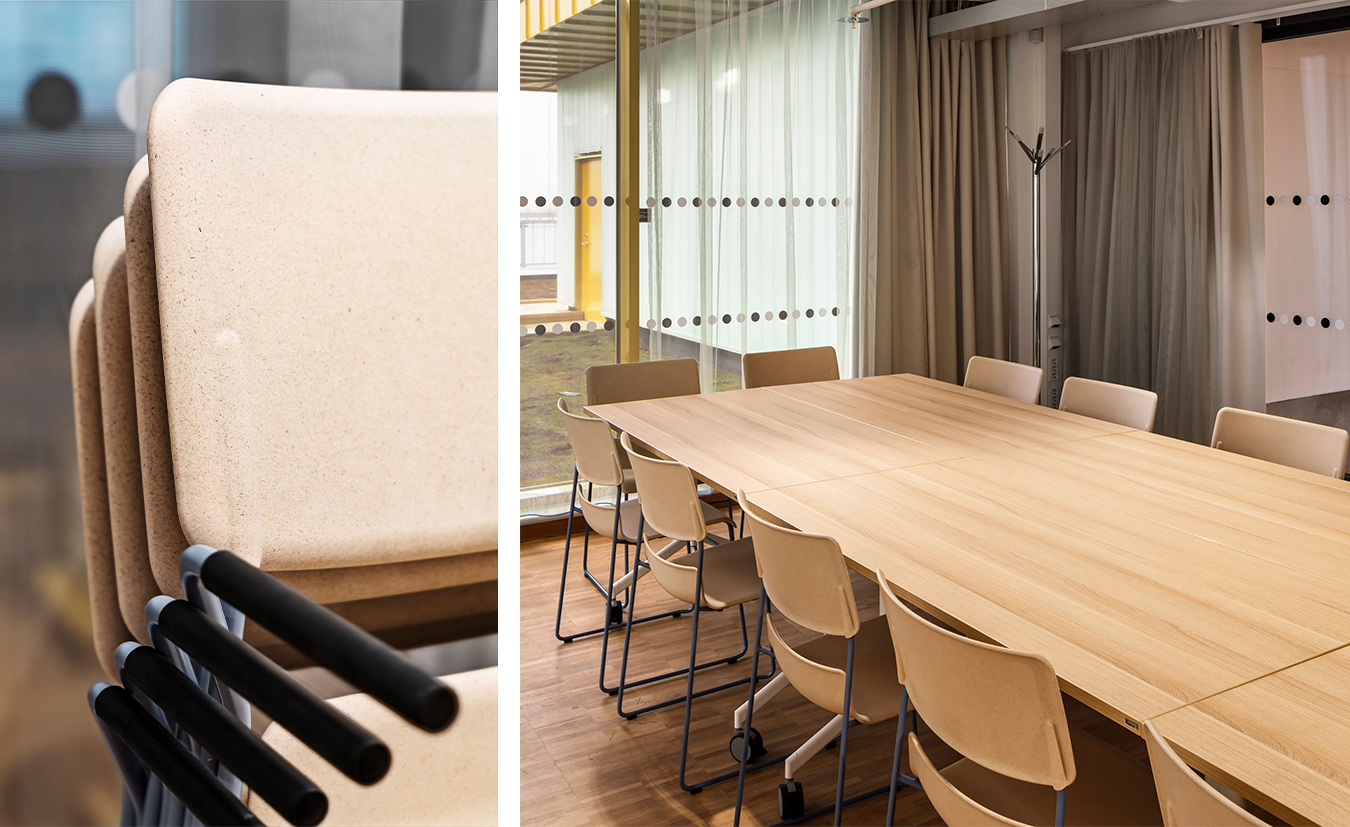 Meeting space with sustainable and flexible thinking. The Foldex folding tables are easy to fold up and move as necessary. The D2 chair is made of recycled plastic and natural fiber for a sustainable choice.