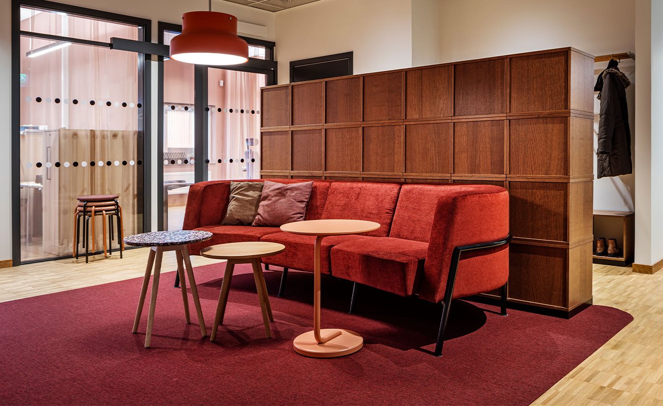 Reused meets new. The reused Trix sofa was upholstered in a warm red hue and, together with the newly produced Tinnef and Curling tables, creates a harmonious place for reading, snugly screened off with the Space storage unit.