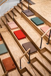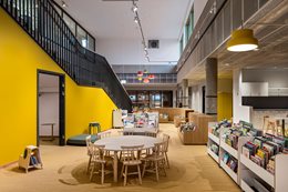 The three floors of the new library have different functions, and the interior design features wood, nature and muted colours, with themes such as sea, forest, fields, haze and twilight. The ground floor of the library includes the reception, adult department, drop-in areas, study spaces, a magazine corner and stage. The first floor is furnished for children and young people, with cosy reading spaces, story rooms and study spaces, a café, as well as staff rooms with workstations, meeting rooms and a pleasant lounge. And on the second floor, there are flexible rooms for co-working and association activities, as well as a spacious roof terrace.