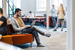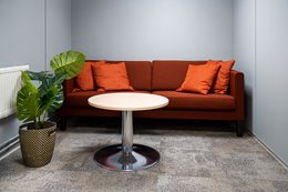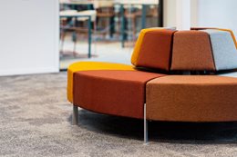 Priestory na štúdium s odolnou stoličkou Nilo, tu na kolieskach pre väčšiu flexibilitu. Čalúnený nábytok a koberec zlepšujú akustické prostredie a umožňuje lepšie sa sústrediť.