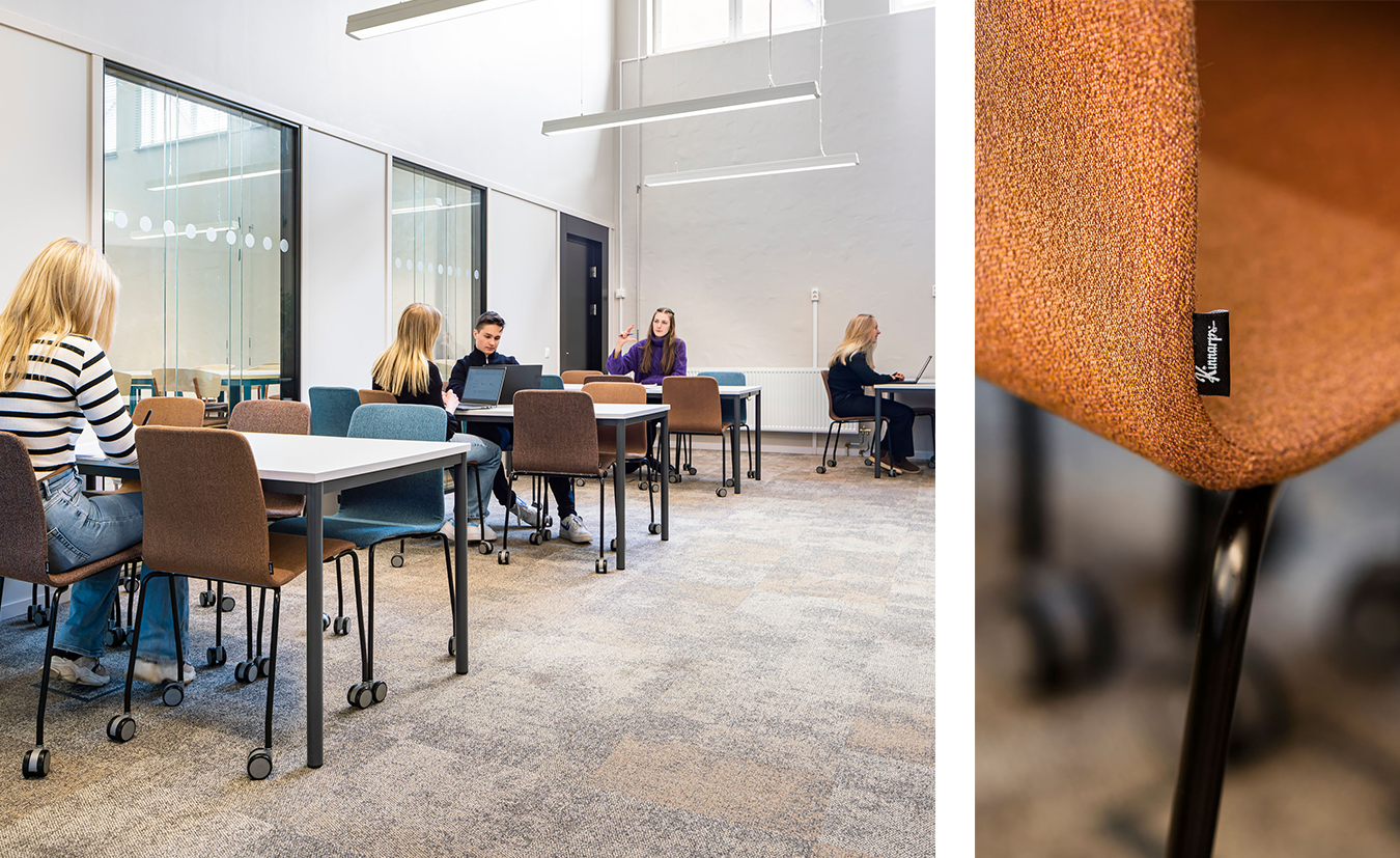 Jedna zo skupinových miestností je zariadená recyklovaným nábytkom, ktorý bol opatrne integrovaný do novej školy. Stôl Origo dostal novú dosku a starší model stoličky Kinnarps bol prečalúnený.