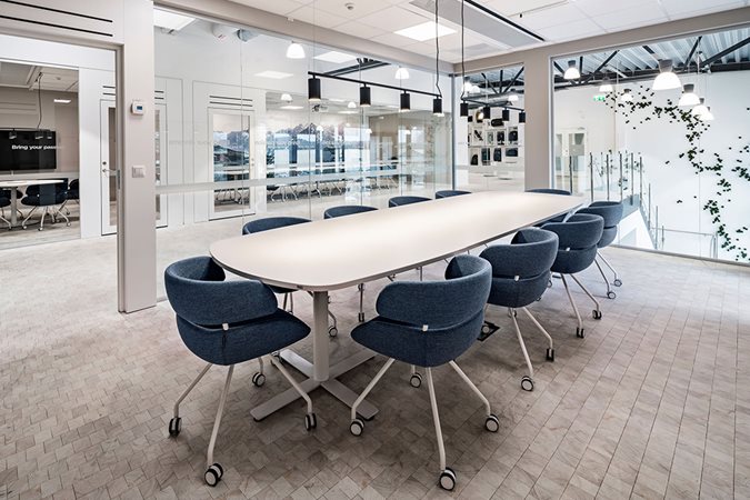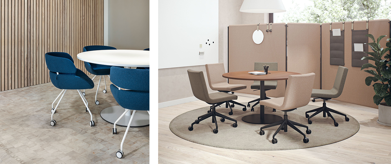 Flexibilita. Bude miestnosť slúžiť na rôzne účely a mala by sa dať ľahko reorganizovať? Výškovo nastaviteľný rokovací stôl uľahčuje zmeny polohy medzi sedením a státím. Vo veľkých konferenčných miestnostiach poskytujú stohovateľné stoličky a skladacie stoly možnosť upraviť miestnosť v závislosti od počtu účastníkov a potrieb stretnutia. Menšie stoly, ktoré možno usporiadať v rôznych konšteláciách, sú dobrým zariadením pre hybridné stretnutia.
