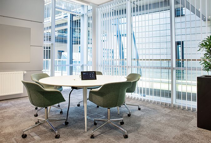 Uzavreté alebo otvorené prostredie. Tradične sú konferenčné miestnosti navrhnuté so štyrmi stenami a dverami, ktoré sa dajú zavrieť. S inteligentnými interiérovými riešeniami je možné konferenčnú miestnosť rovnako jednoducho navrhnúť aj v otvorenom prostredí a to pomocou deliacich textílií, nábytku alebo paravánov a podpornej technológie. Vďaka tomu je kancelária flexibilnejšia a umožňuje používateľom dané prostredie meniť.