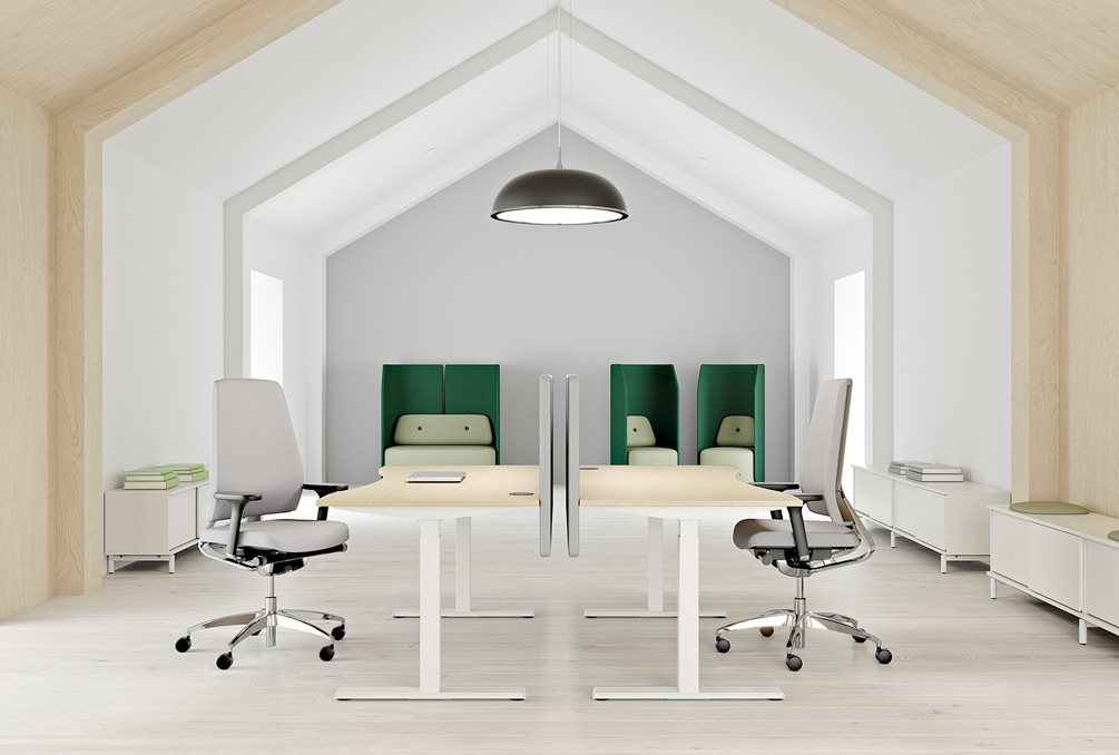 Pohoda pri práci a dobrá ergonómia sú oveľa viac, než len možnosť počas pracovného dňa stáť alebo správne sedieť. Existuje mnoho ďalších faktorov, ktoré ovplyvňujú naše zdravie, ako sú hladina zvuku, osvetlenie a kvalita ovzdušia. Svetlo má na nás veľký vplyv a ak máme efektívne pracovať, kvalita osvetlenia je dôležitá. Pokiaľ ide o zvuk, výskumy ukazujú, že akustické prostredie ovplyvňuje to, ako sa cítime a celkovo našu produktivitu. Dokonca aj na úrovni 55 dB, 40% pracovníkov v kancelárii pociťuje zhoršenú koncentráciu2. Preto je dôležité, aby ste pri zariaďovaní kancelárie, bez ohľadu na typ riešenia alebo typ pracoviska, považovali hluk za dôležitú súčasť celkového obrazu. Kancelárie s vyrovnanou hladinou hluku podporujú tak pohodu pri práci, ako aj úspech. Kvalita ovzdušia je tiež dôležitá, pretože zlá ventilácia môže znížiť produktivitu až o 15%3. Ako veľmi viete prispôsobiť ventiláciu, zvuk a osvetlenie vo vašej kancelárii? Kľúčom je pozrieť sa na celkový obraz pracoviska a vytvoriť dobre premyslené pracovné prostredie.