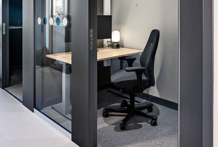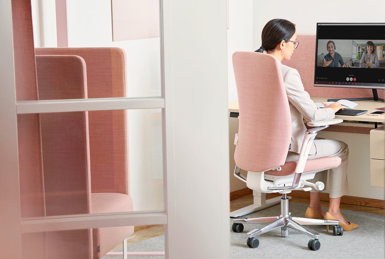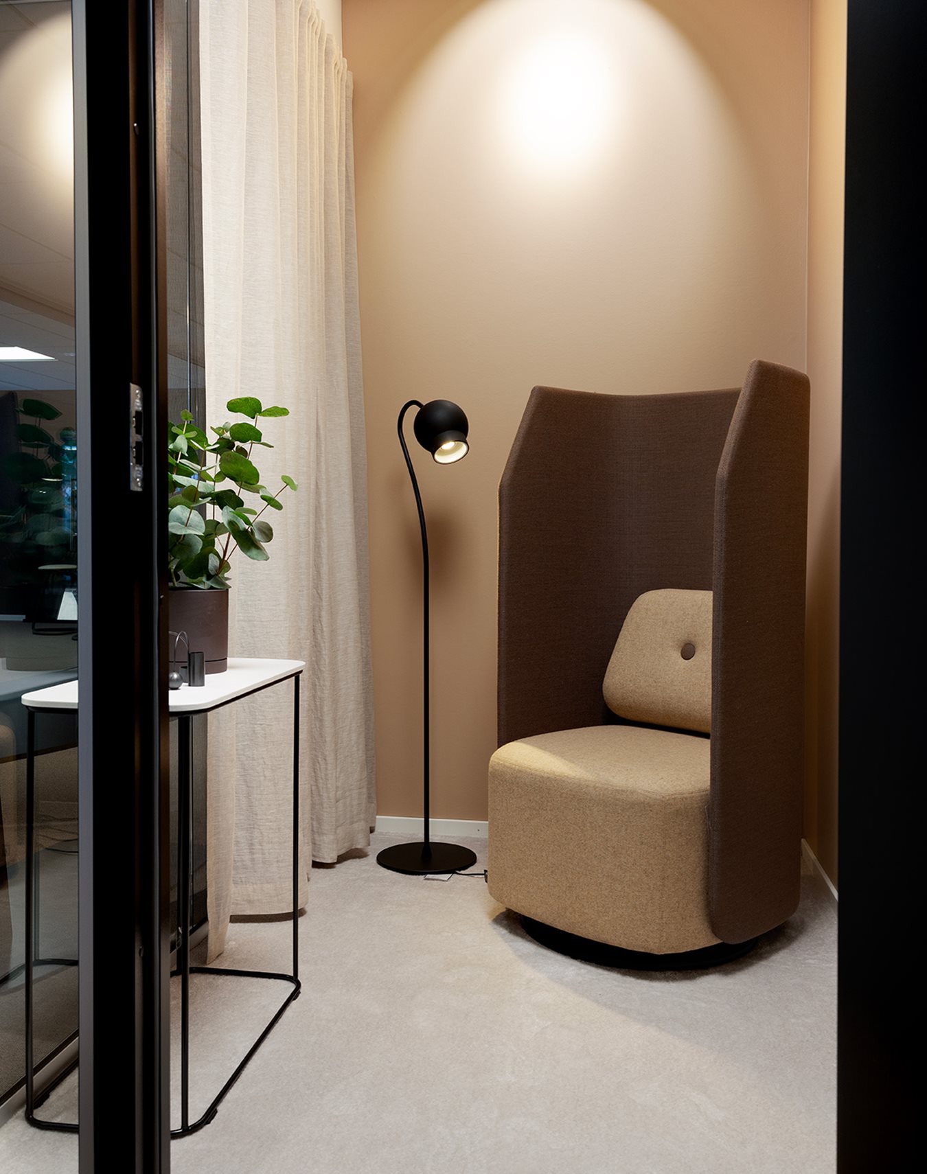 Menší súkromný priestor pre virtuálne stretnutia a hovory cez telefón alebo počítač. V prípade potreby je tu miesto pre notebook, ale aj dokumenty a poznámky. Stolička je vhodná na krátke aj dlhé rozhovory a virtuálne stretnutia. V prípade potreby je možné miestnosť uzavrieť a odhlučniť. Dá sa použiť ako polootvorené prostredie predelené paravánmi alebo nábytkom s vysokým operadlom.