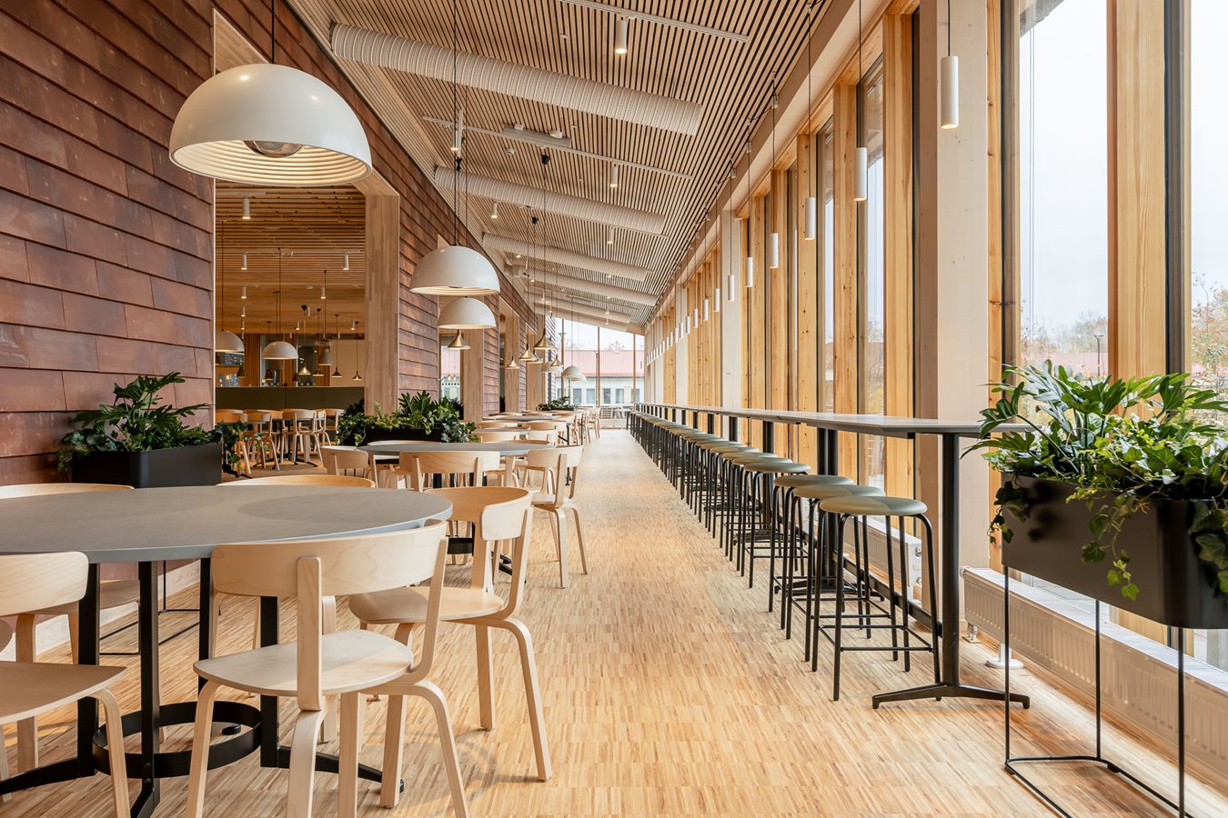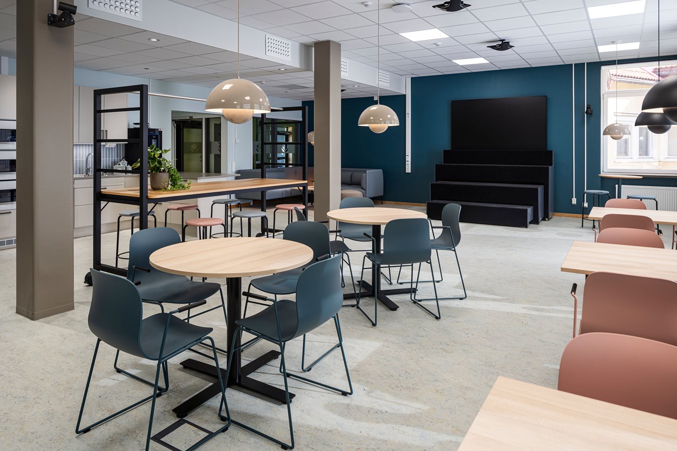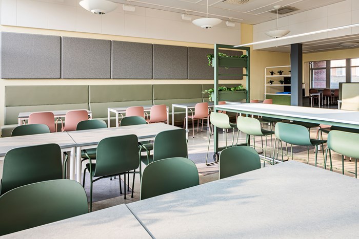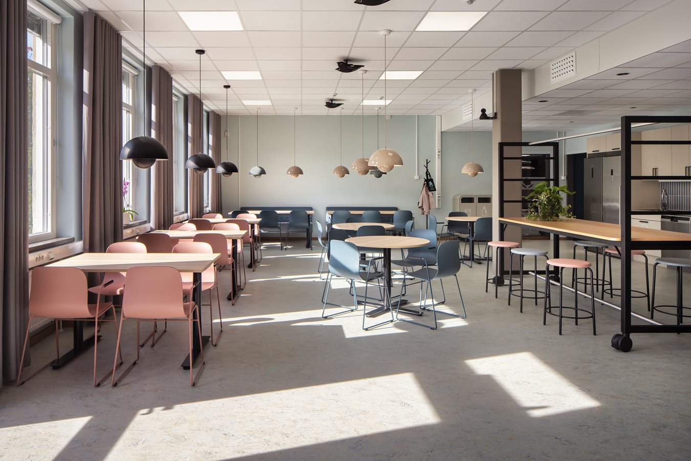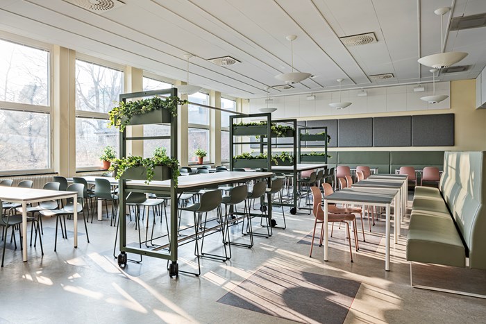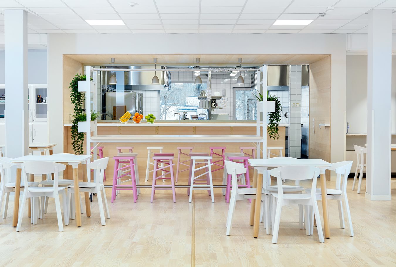 Školská jedáleň je často využívaná len na obed počas niekoľkých hodín uprostred dňa, ale s pestrým zariadením sa dá využiť aj na iné aktivity počas zvyšku dňa či večera. Všestranné dizajnové riešenie s viacerými ergonomickými možnosťami sedenia a státia v rôznych zónach, ako aj správne digitálne riešenia z nej robia dokonalý priestor pre individuálnu a skupinovú prácu, ako aj pre väčšie prezentácie a podujatia. Materiály, ktoré odolajú poliatiu a škvrnám a nábytok, ktorý sa ľahko čistí, poskytuje jednoduchú údržbu, čo zabezpečí, že nábytok dlho vydrží. Zvuk pohlcujúce dosky stolov a akustické paravány na stenách vytvárajú dobré akustické prostredie a pomocou paravánov na kolieskach je ľahké miestnosť rozdeliť a vytvoriť útulné a príjemné prostredie aj v najväčšom otvorenom priestore v škole.