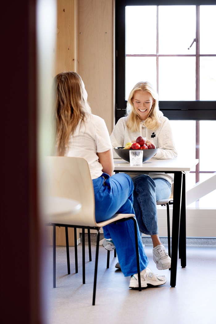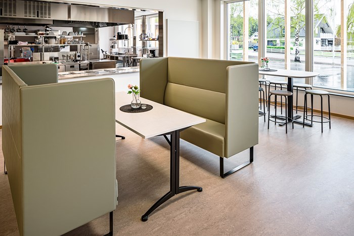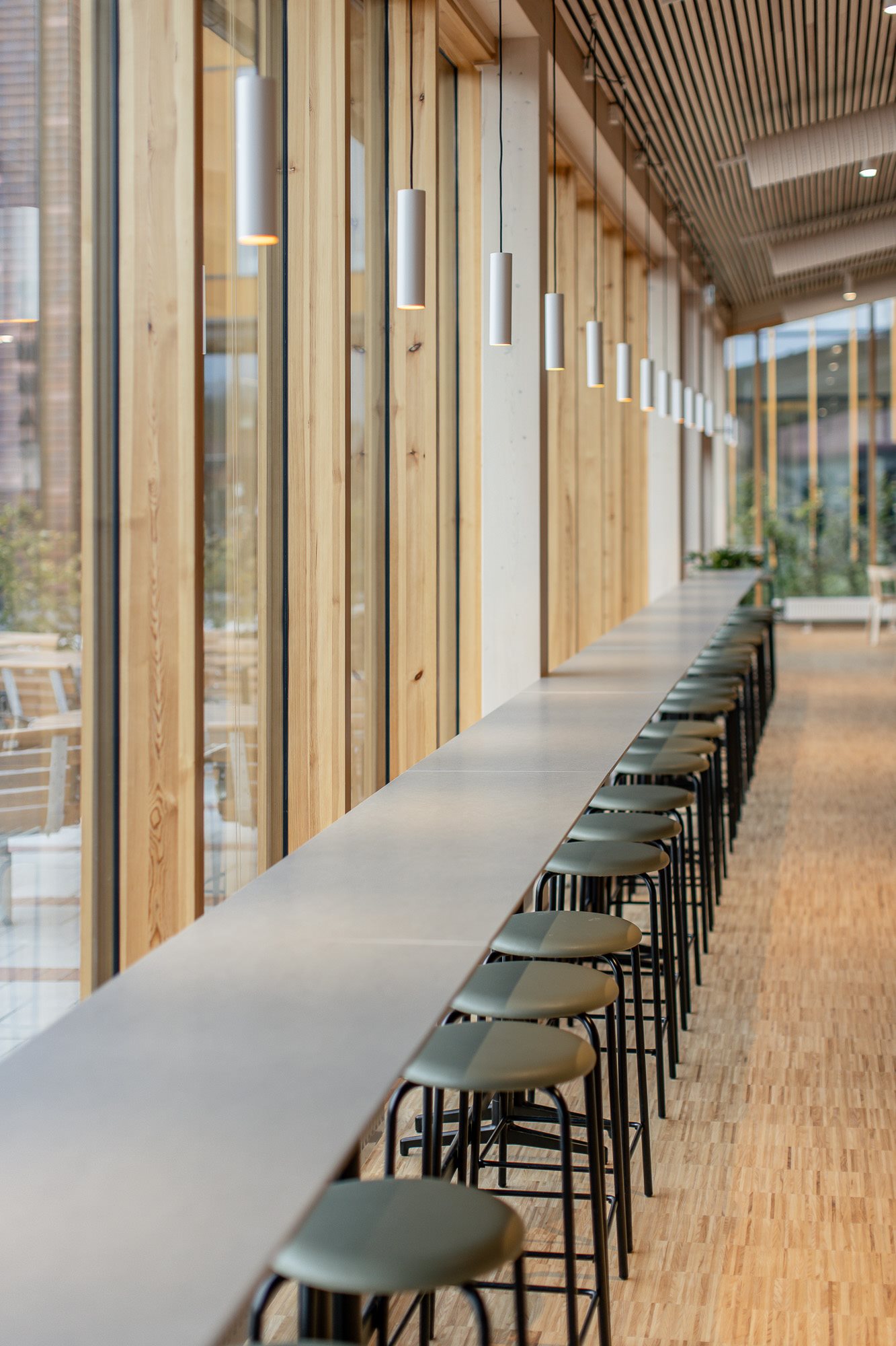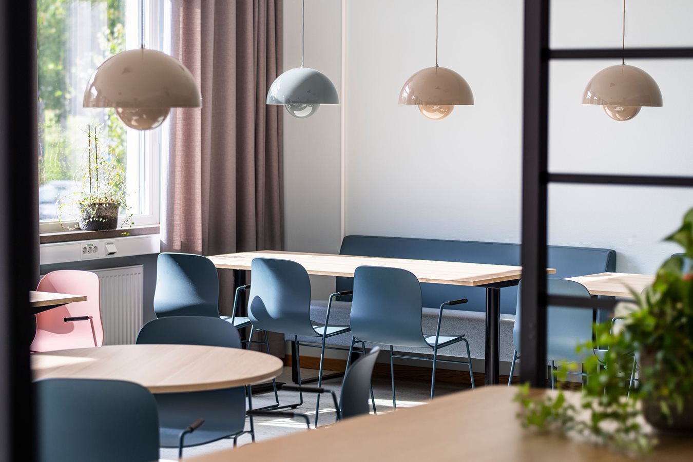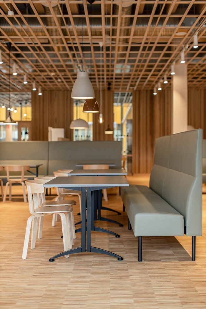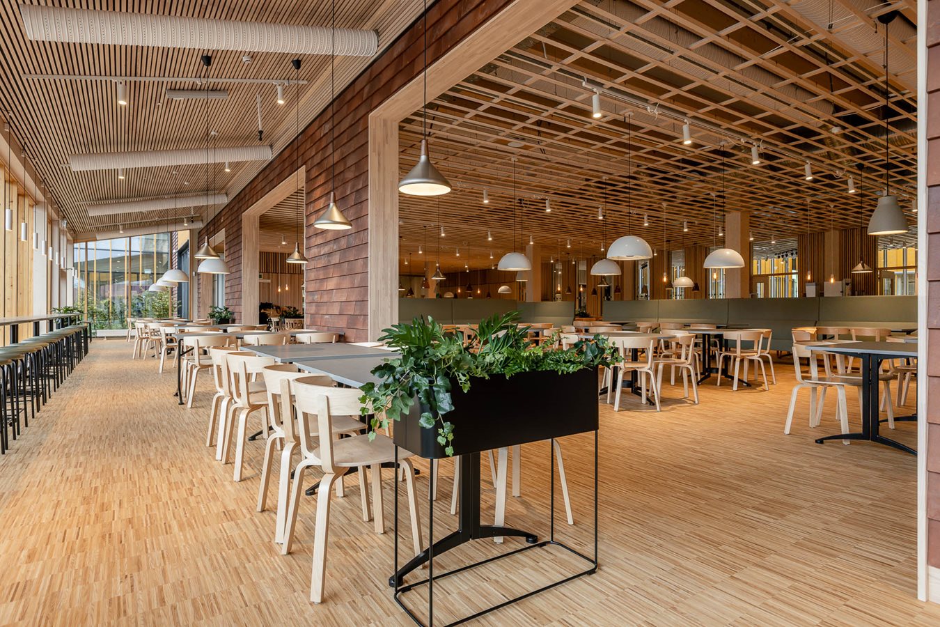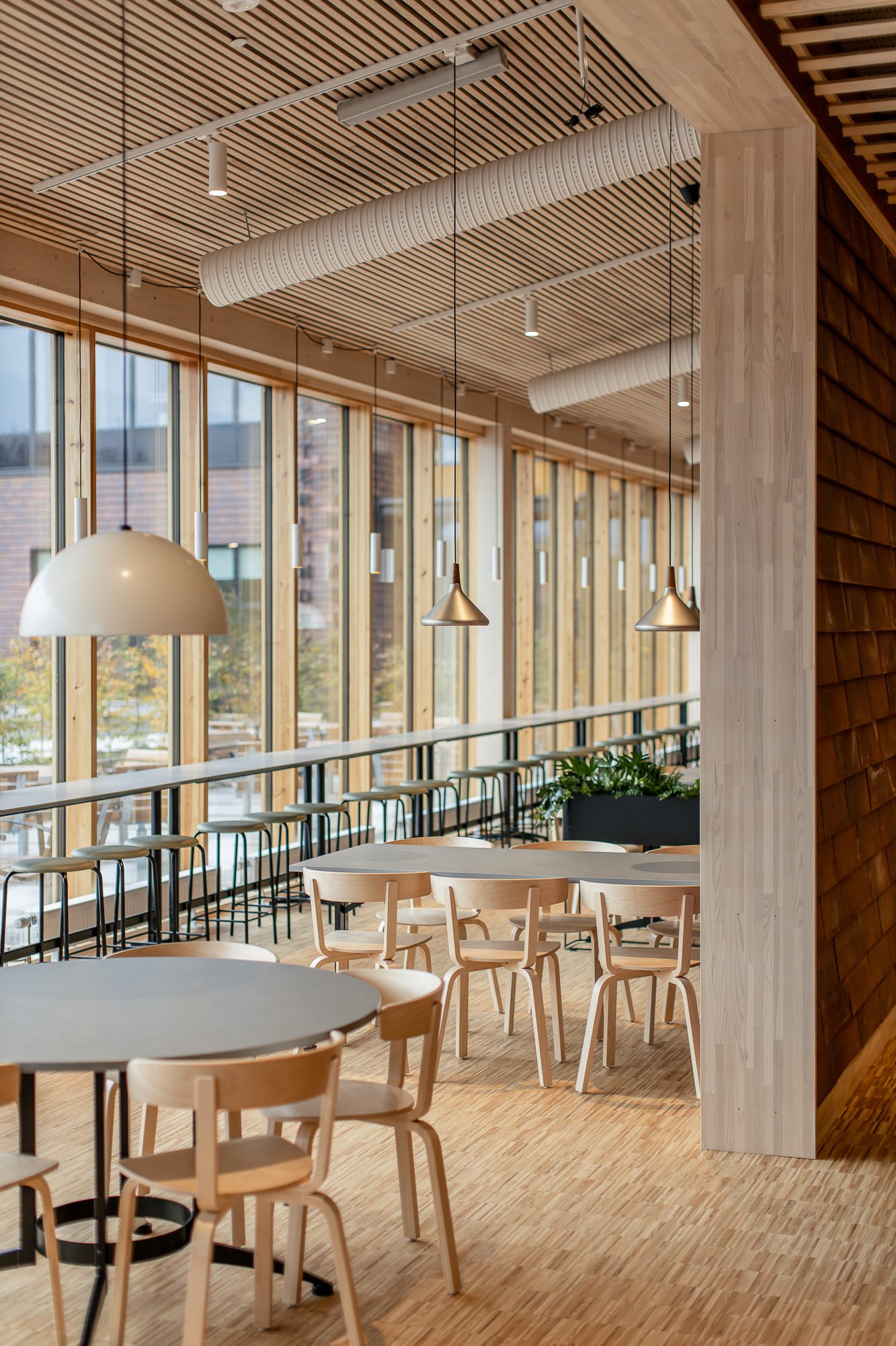 Školská jedáleň je často využívaná len na obed počas niekoľkých hodín uprostred dňa, ale s pestrým zariadením sa dá využiť aj na iné aktivity počas zvyšku dňa či večera. Všestranné dizajnové riešenie s viacerými ergonomickými možnosťami sedenia a státia v rôznych zónach, ako aj správne digitálne riešenia z nej robia dokonalý priestor pre individuálnu a skupinovú prácu, ako aj pre väčšie prezentácie a podujatia. Materiály, ktoré odolajú poliatiu a škvrnám a nábytok, ktorý sa ľahko čistí, poskytuje jednoduchú údržbu, čo zabezpečí, že nábytok dlho vydrží. Zvuk pohlcujúce dosky stolov a akustické paravány na stenách vytvárajú dobré akustické prostredie a pomocou paravánov na kolieskach je ľahké miestnosť rozdeliť a vytvoriť útulné a príjemné prostredie aj v najväčšom otvorenom priestore v škole.