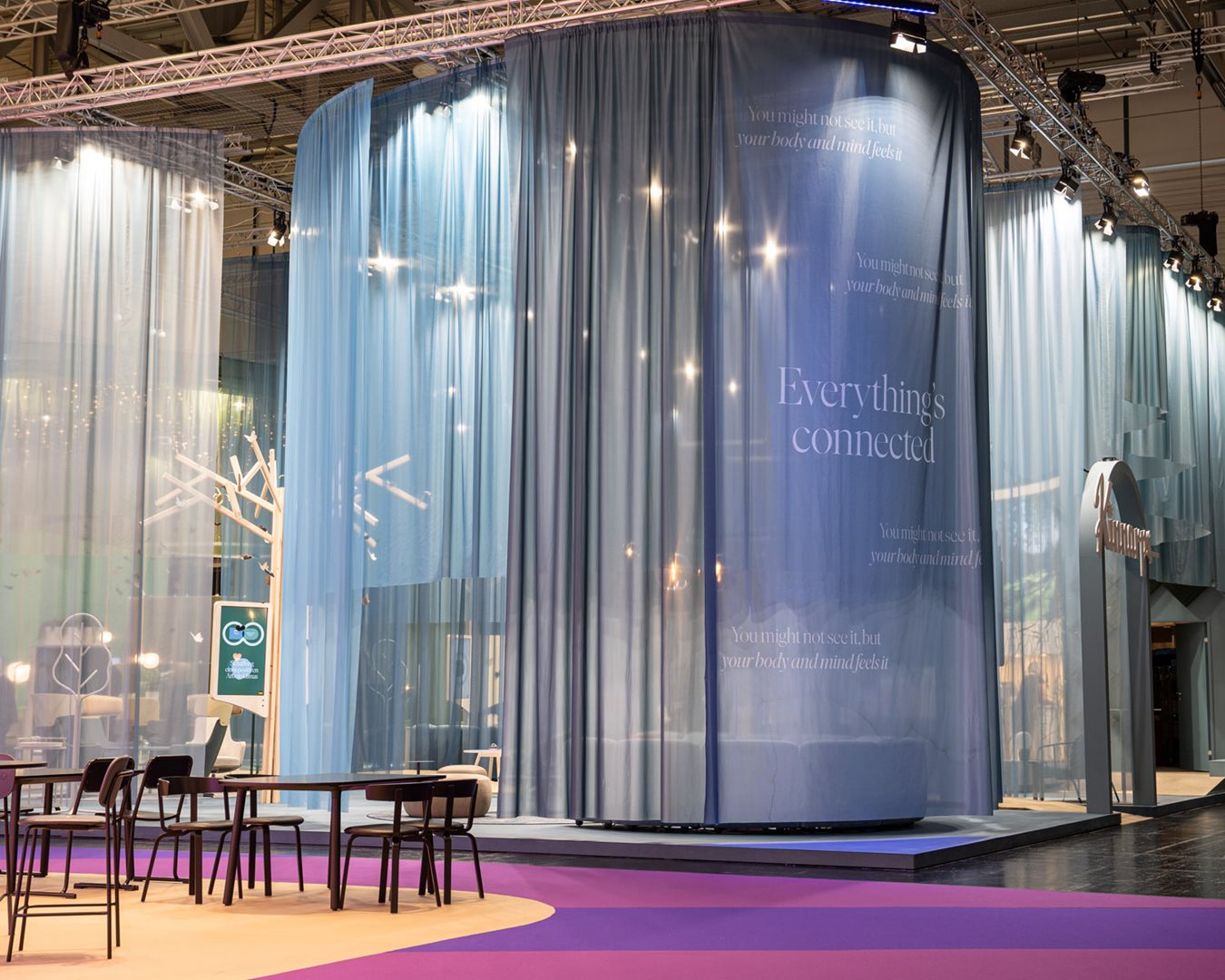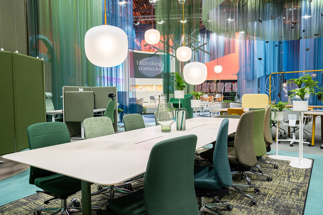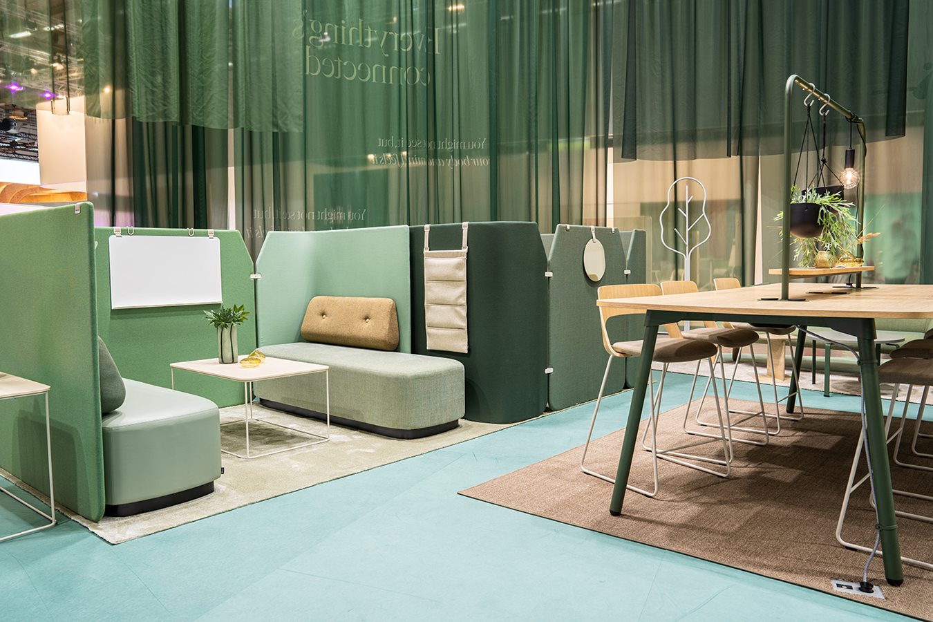 The trade fair stand, inspired by Swedish nature, has the motto “Everything's connected” and makes it clear that ergonomics in the office is characterised by the entire physical and social environment and is not just defined by individual pieces of furniture.