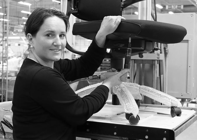 Ramona Drescher, okrem iného, pracuje pri zostavovaní kancelárskych stoličiek, od začiatku až do konca, kým sú pripravené na doručenie. "Páči sa mi, že v Kinnarps mám mnoho príležitostí na rozvoj, pracujem s rôznymi úlohami a keďže som z Nemecka, sprevádzam aj nemeckých návštevníkov a pomáham novým kolegom z Nemecka."