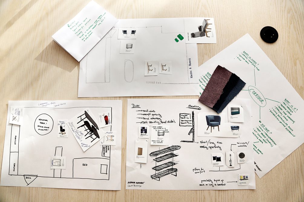 „Kinnarps logo inšpirovalo samotnú formu. Najmä bodka (hviezda) nad písmenom „i“. V posledných týždňoch sme mali veľa nápadov o tom, ako podoba nábytku môže uľahčiť stretnutia ľudí. Môžeme vyrobiť otáčací mechanizmus na dennej posteli? Alebo môžeme vyrobiť moduly z dosiek?“