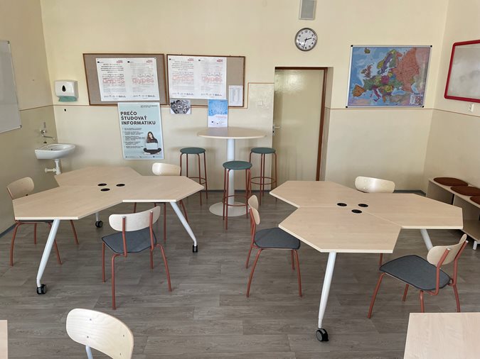 Zariadenie IT učebne. Cieľom bolo vytvoriť IT učebňu inak, ako len uložiť stoly po obvode stien. Dodaný školský nábytok - stoly v tvare šesťuholníka, nízke skrinky s podsedákmi na sedenie, umiestnené pri stene, či vyššie stoličky so stolom pre prácu v stoji - podporujú spoluprácu žiakov medzi sebou ako aj medzi učiteľom a žiakmi.