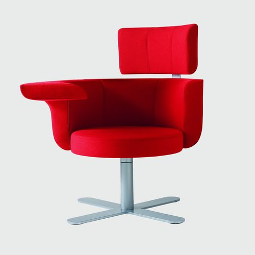 Celočalúnené kreslo s príjemným dizajnom, mäkkým polstrovaním a otočným mechanizmom pre plynulý pohyb. Krížová základňa s lakovanou kovovou centrálnou nohou. Zaoblená lakťová opierka na pravej strane, navrhnutá ako pracovná plocha napr. pre notebook.