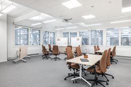 Integrované elektrické zásuvky v nábytku uľahčujú prácu. Nakláňacie stoličky s kolieskami podporujú pohyb počas pracovného dňa.