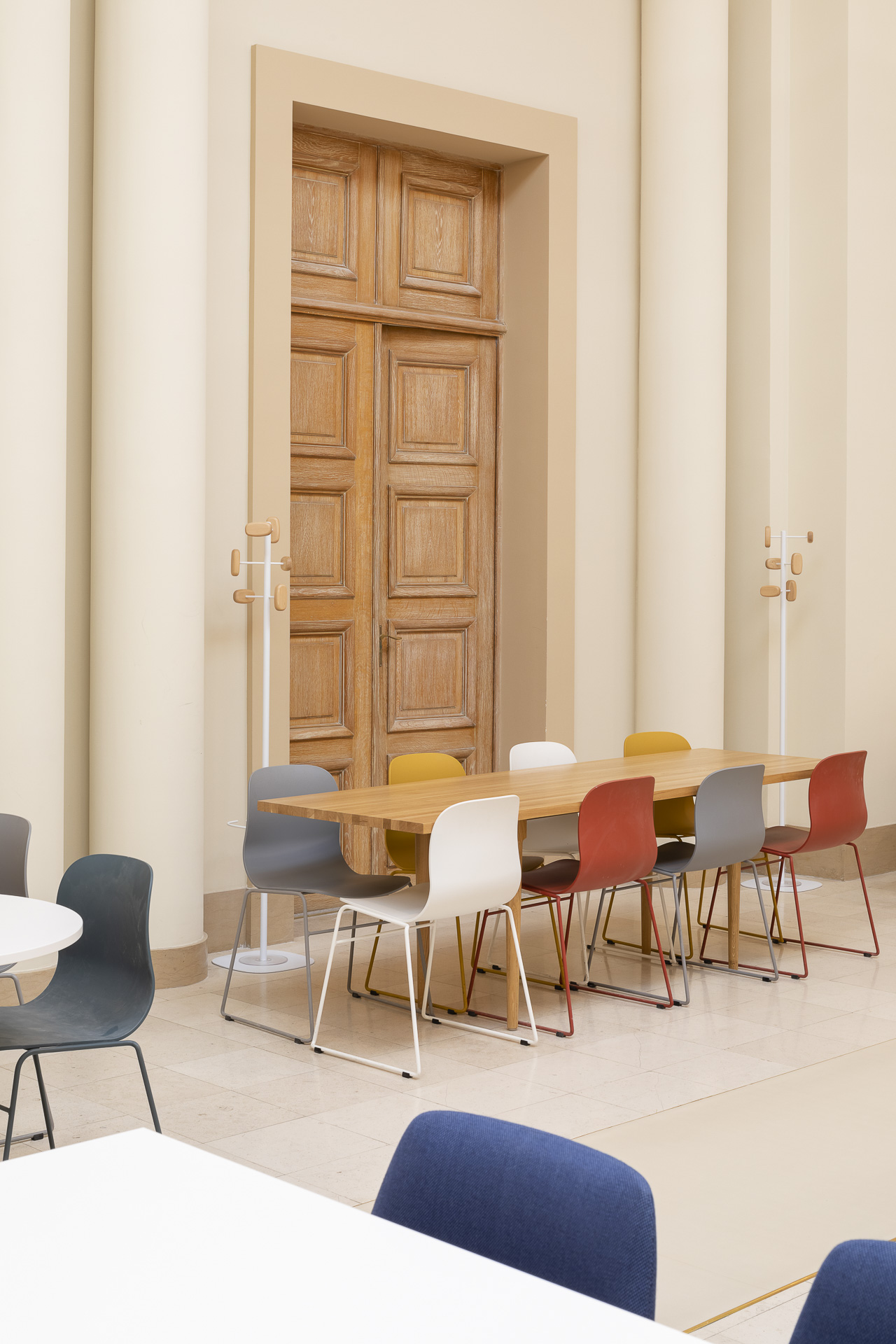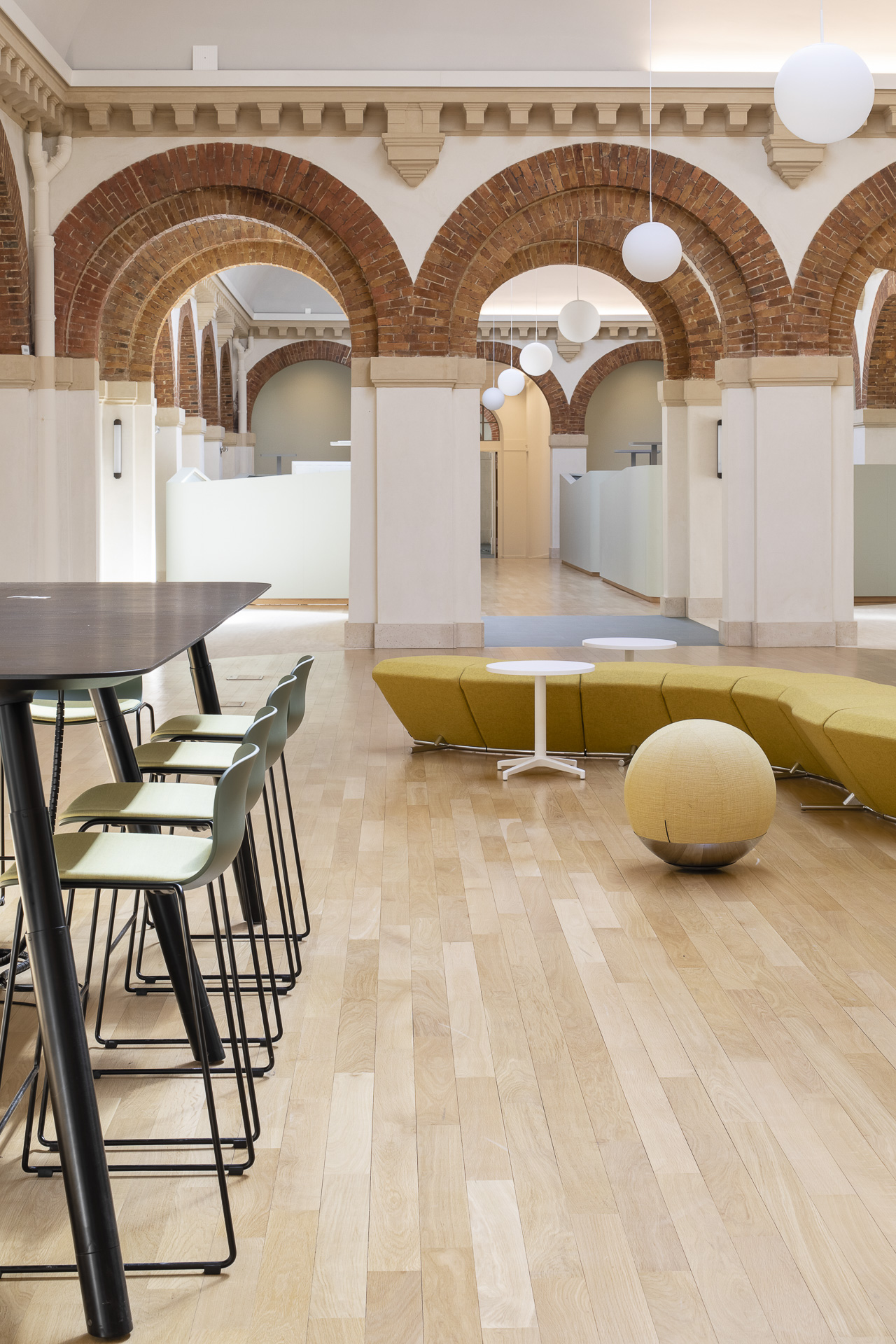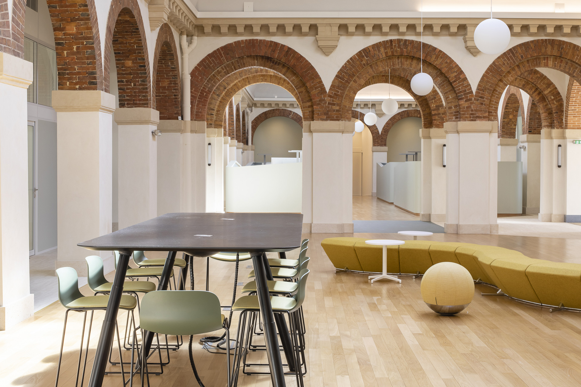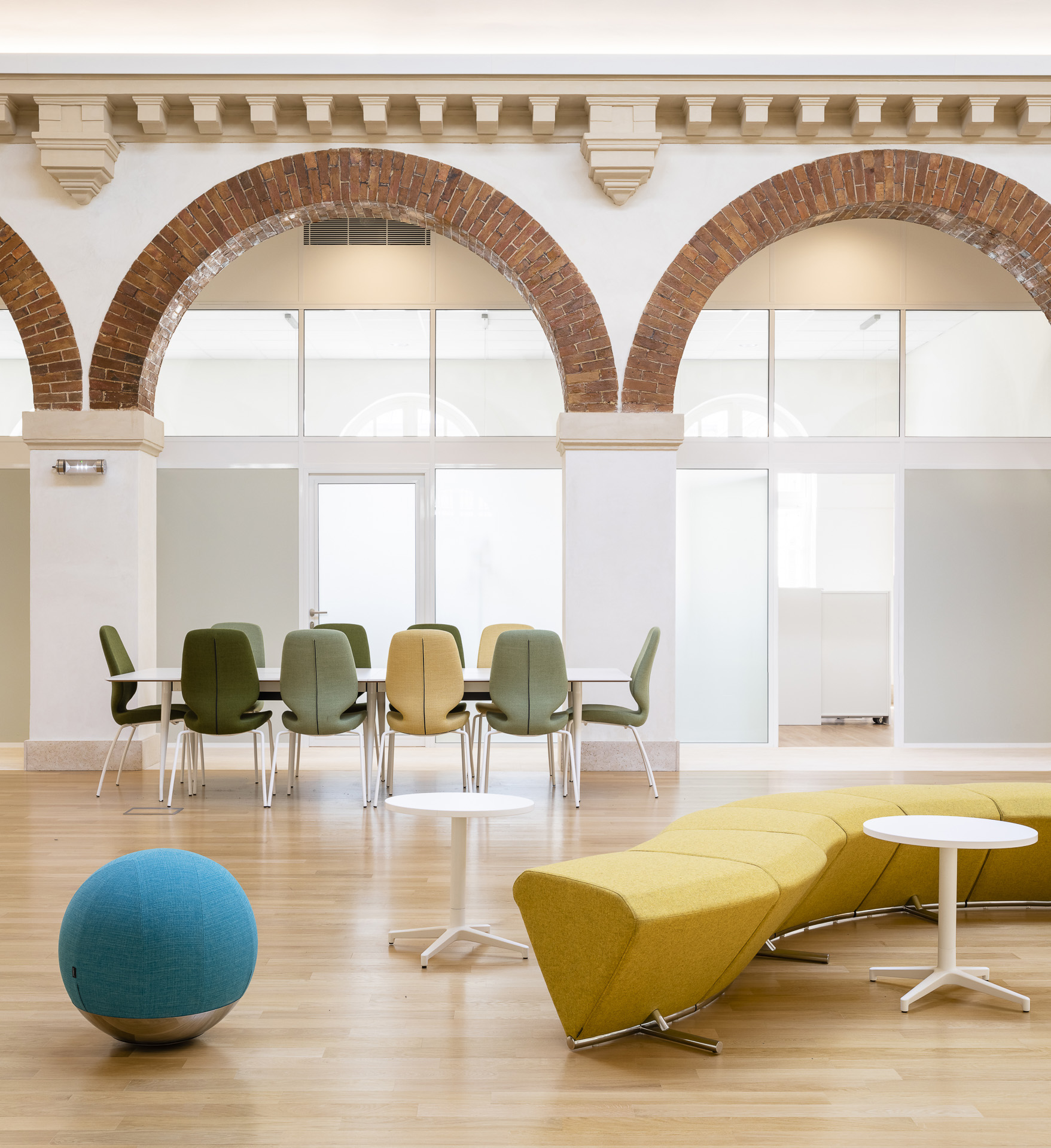 Stôl Hal, Neo Lite barové stoličky, guľovitá sedačka Boullée a sedačka Spino – všetky vo veľkom, presvetlenom, otvorenom priestore. Toto miesto je pozoruhodné veľkým priestorom, ktorý je k dispozícii. Rozmiestnenie nábytku nabáda zamestnancov, aby sa sadli a začali konverzovať.