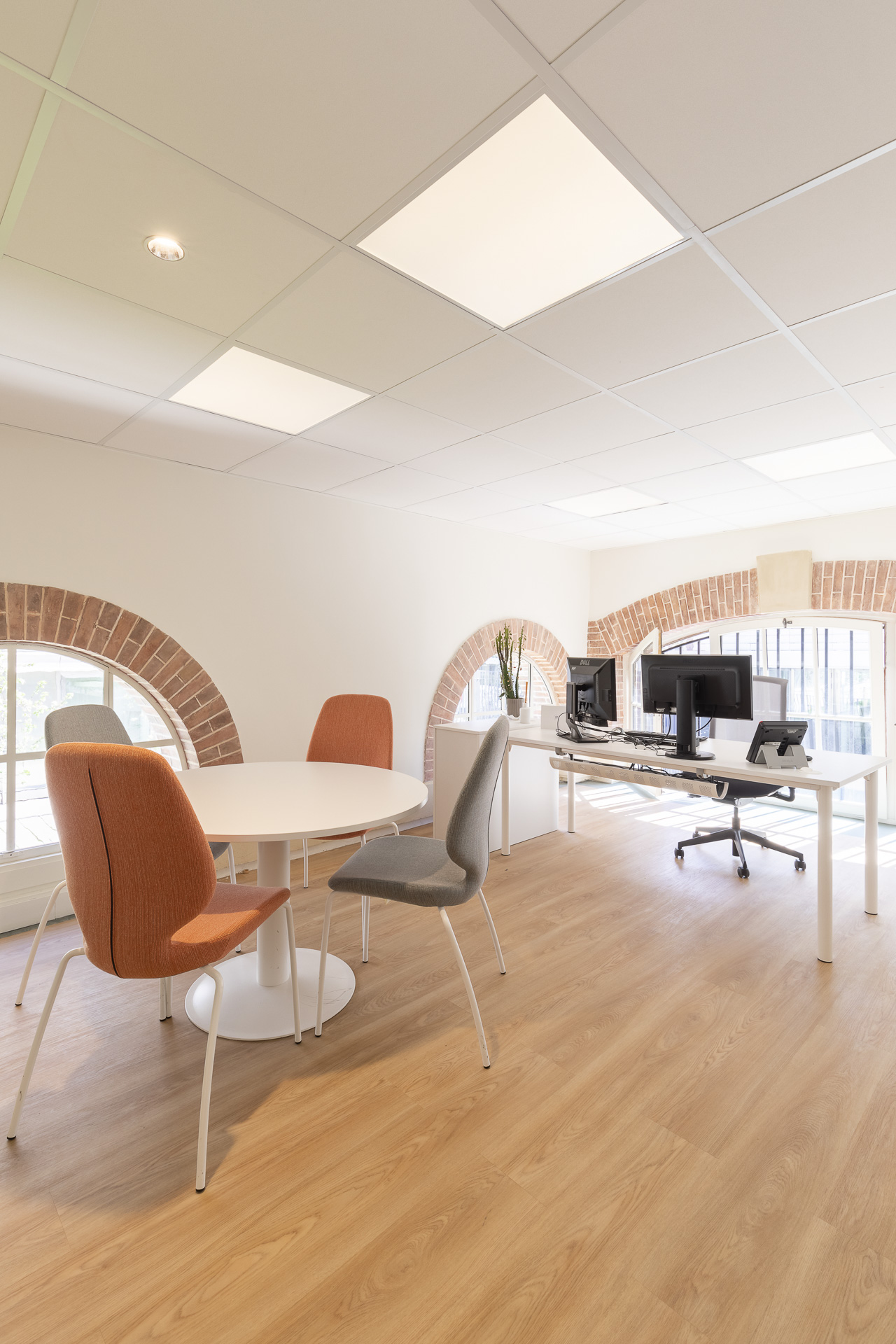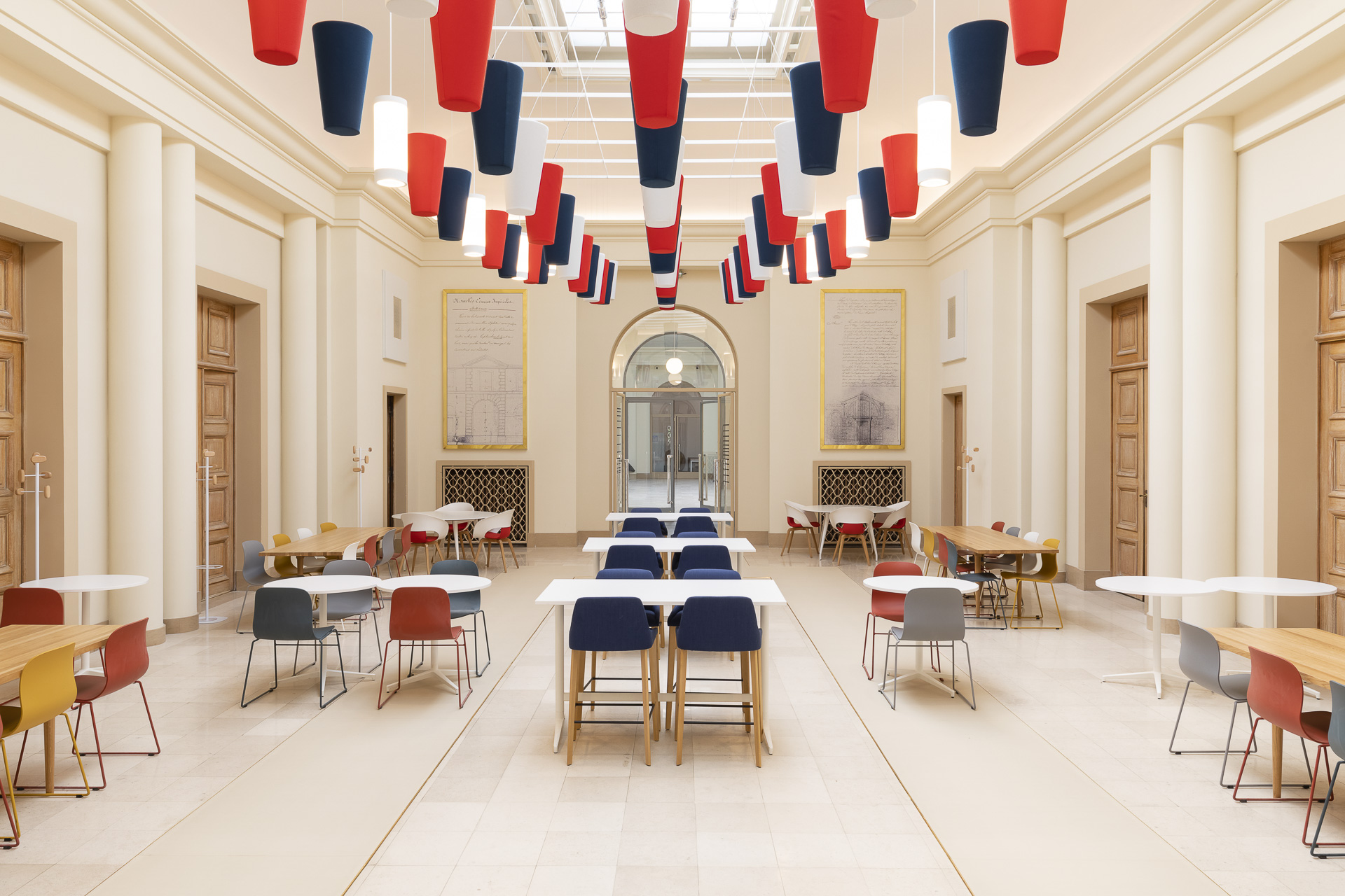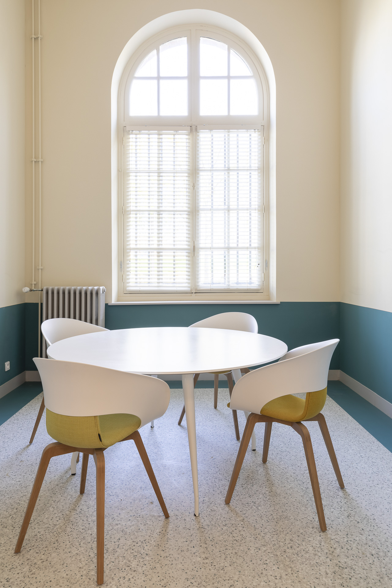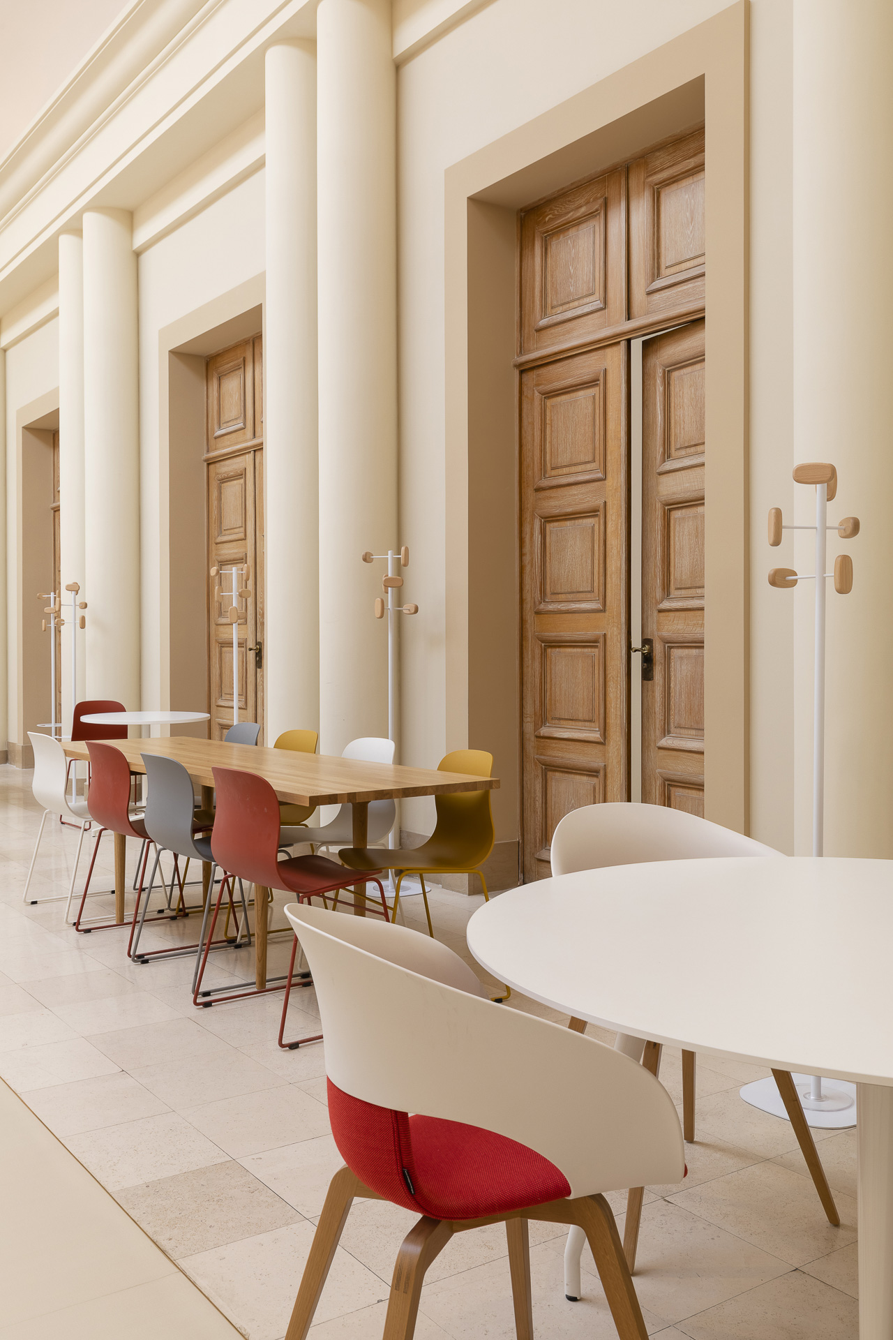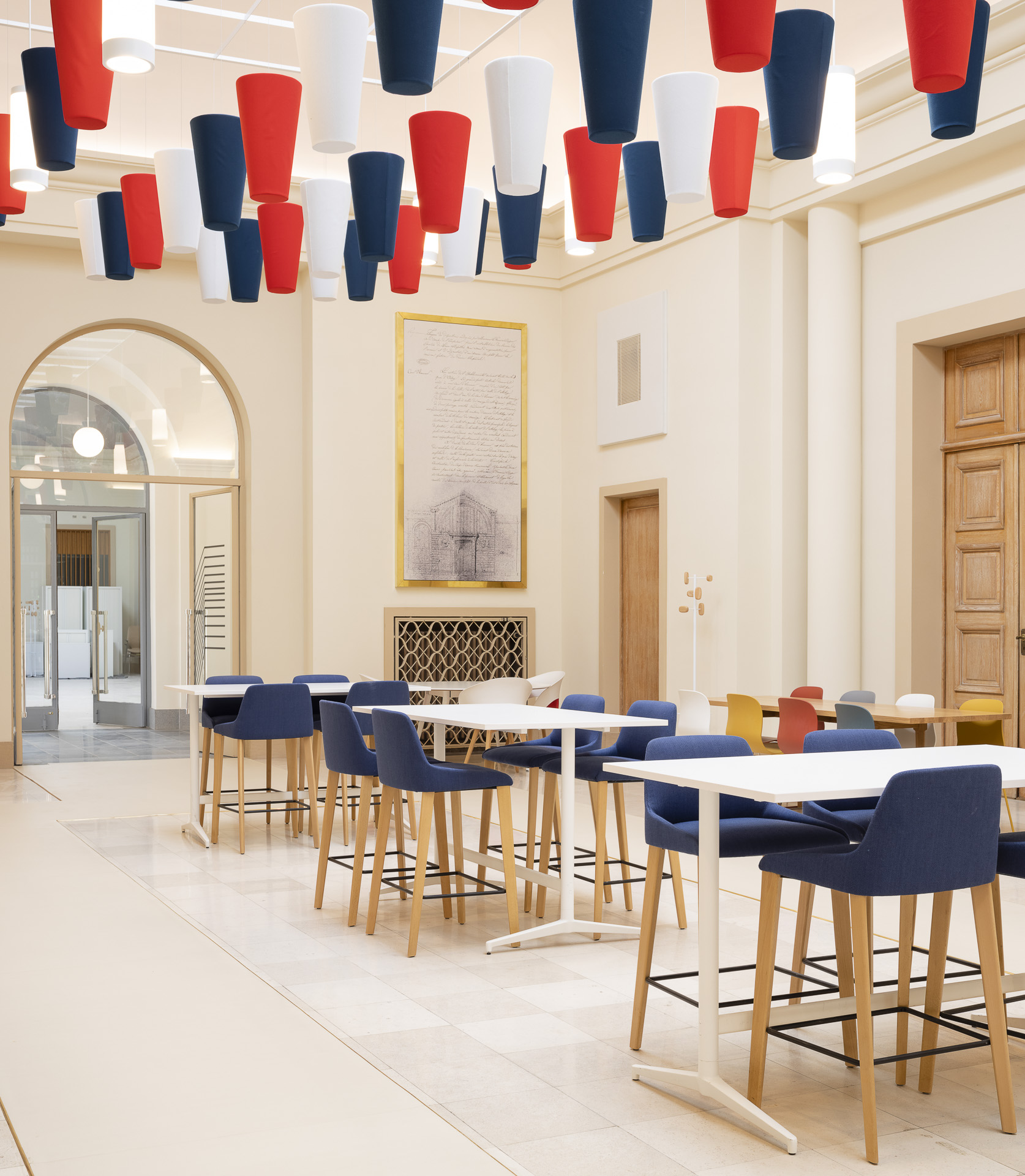 Stôl Hal, Neo Lite barové stoličky, guľovitá sedačka Boullée a sedačka Spino – všetky vo veľkom, presvetlenom, otvorenom priestore. Toto miesto je pozoruhodné veľkým priestorom, ktorý je k dispozícii. Rozmiestnenie nábytku nabáda zamestnancov, aby sa sadli a začali konverzovať.