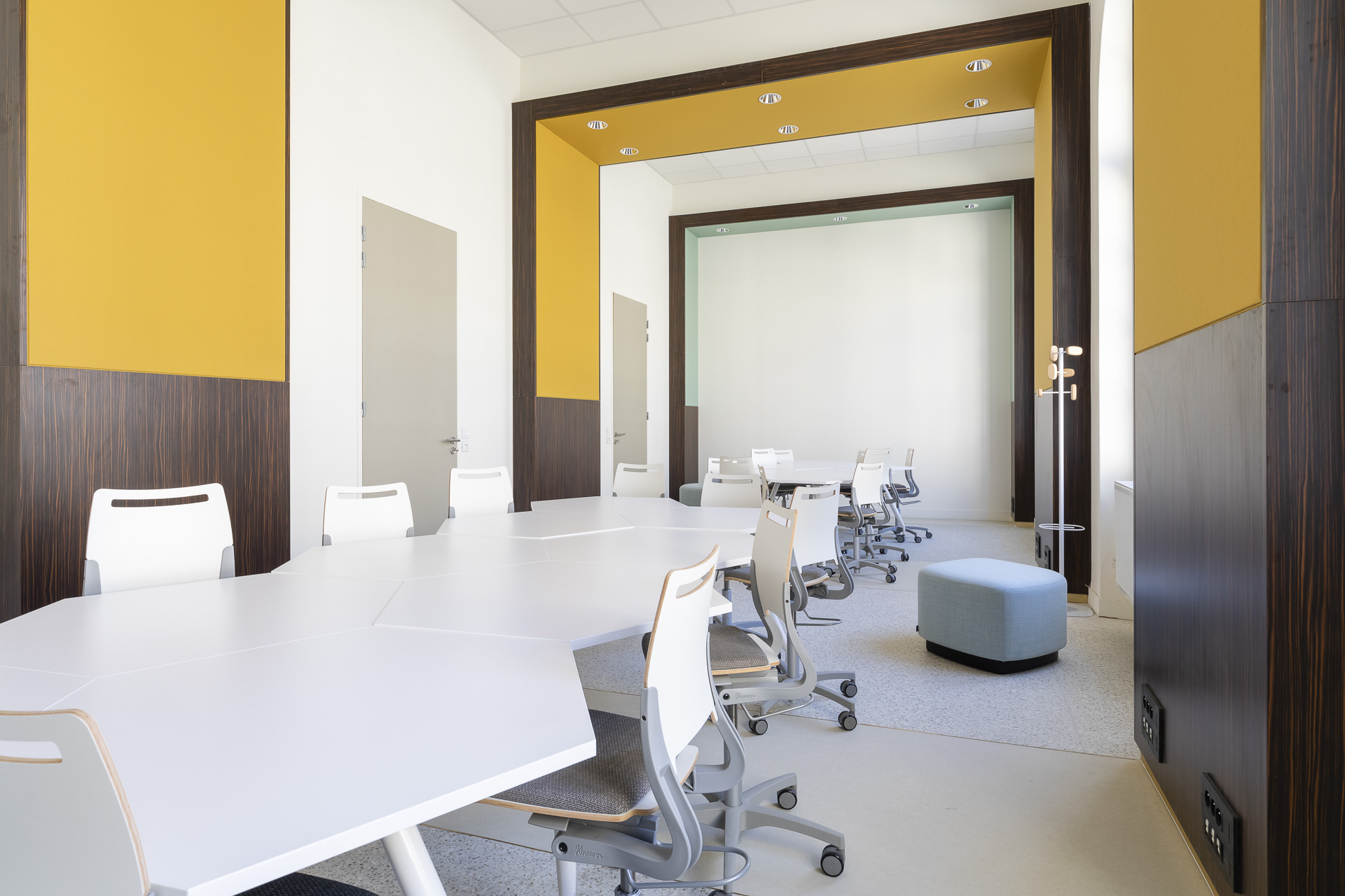 Výsledkom je flexibilný a zároveň všestranný interiér, ktorý sa zameriava na udržateľné riešenia a využíva odolné materiály, ktoré zabezpečujú útulnú atmosféru a akustické pohodlie.
