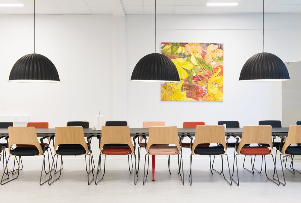 Do obedovej miestnosti pre personál boli zvolené tri stretávacie sekcie, s Kinnarps stoličkami Embrace a s čalúnenými sedadlami pre farebné zdôraznenie. Správna súhra funkčnosti, pružnosti a estetiky podopiera celok a umožňuje konceptu vízie a inšpirácie preniknúť do fyzického prostredia vzdelávania.