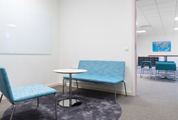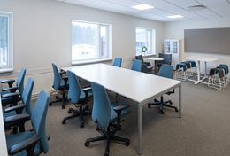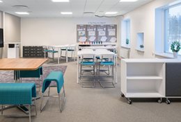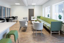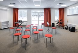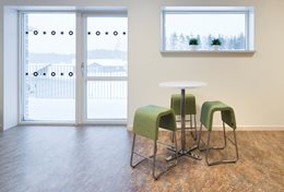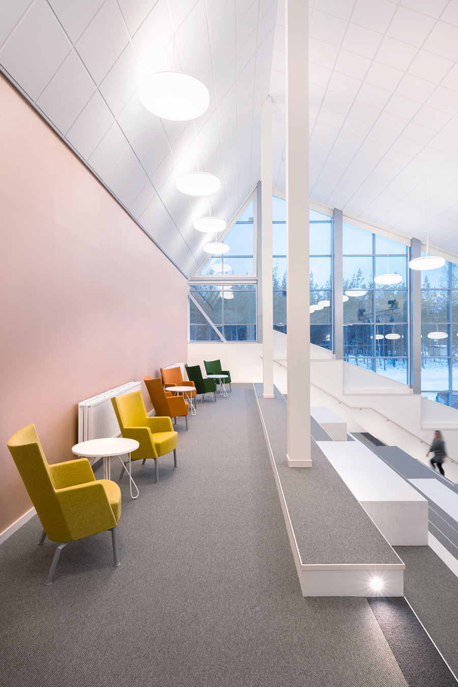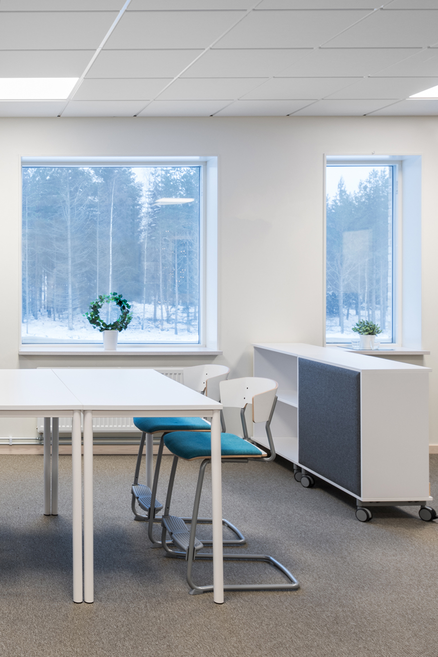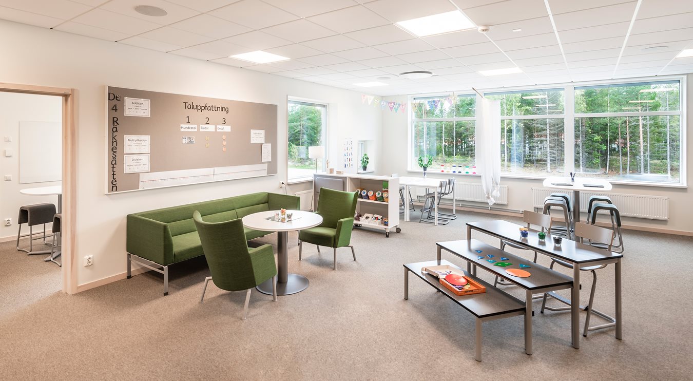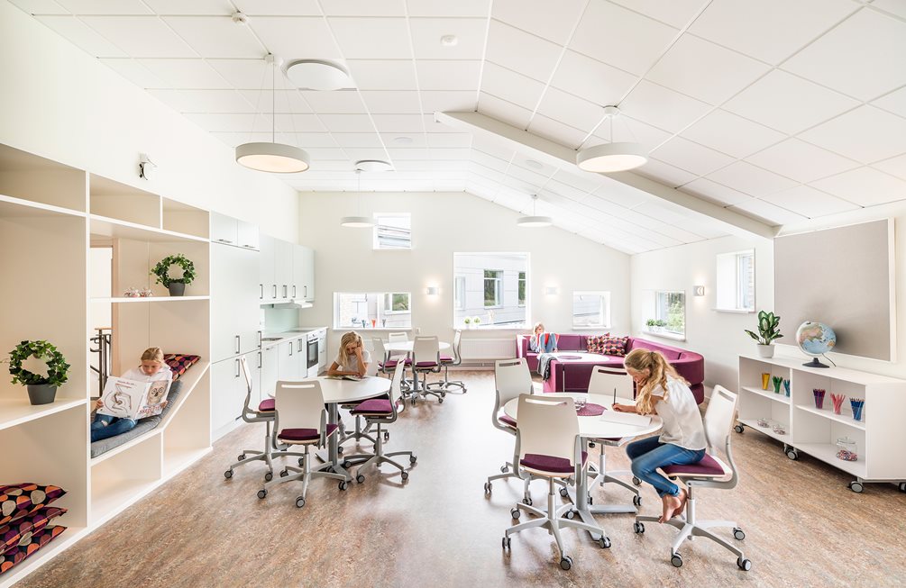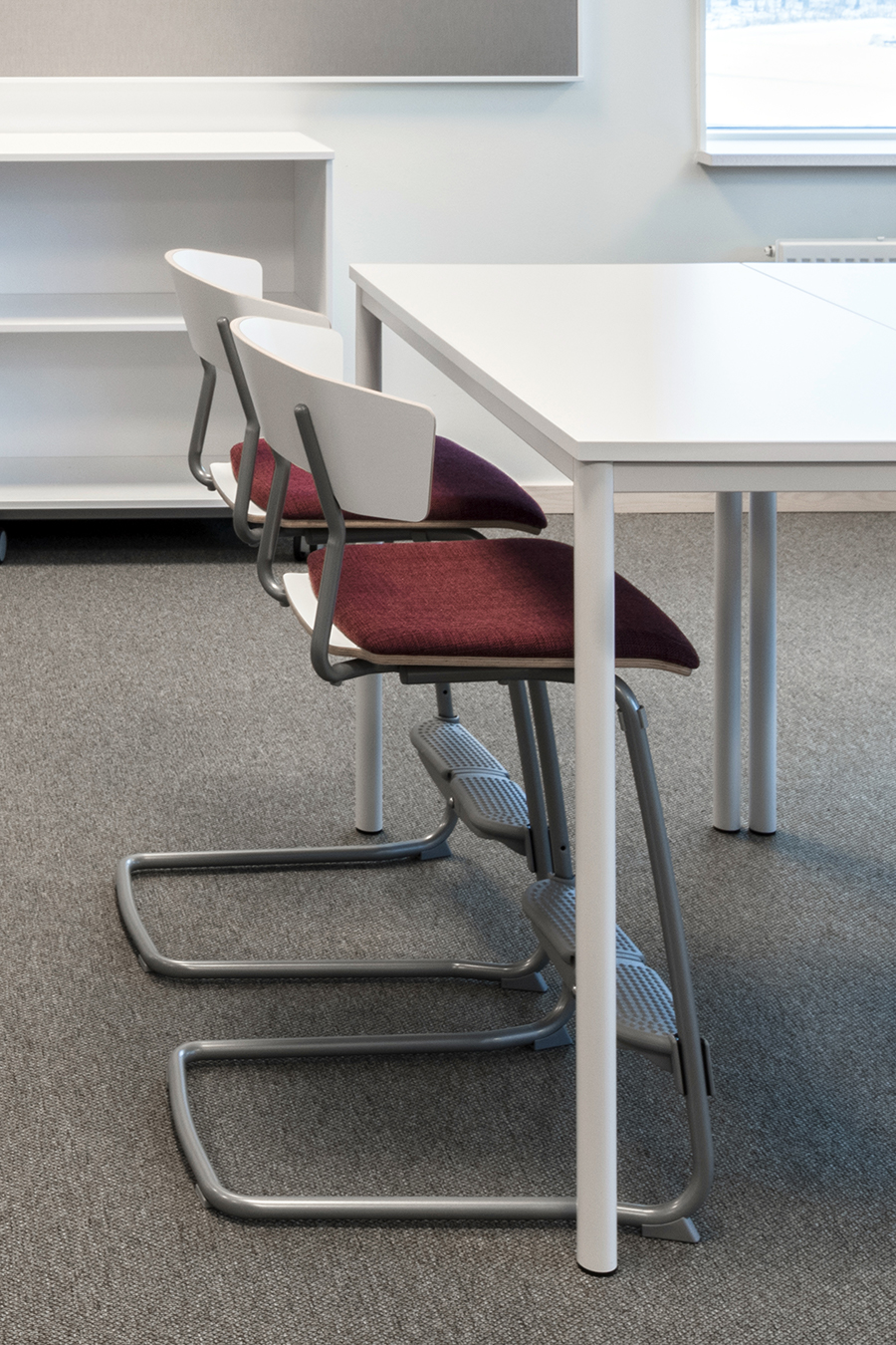 Každá miestnosť ponúka možnosť pracovať v niekoľkých rôznych výškach. Žiaci môžu sedieť priamo na podlahe na mäkkom koberci alebo pracovať za vysokým stolom Origo, ktorý je možné kombinovať so školskou stoličkou Xpect alebo vyššou stoličkou Plint. Riešenie umožňuje striedanie medzi státím a sedením na vyššej stoličke, čo stimuluje aktívnejší spôsob práce. Učebňa ponúka aj nízke sedenie vo forme pohoviek Wilson a kresielok Invito v kombinácii s konferenčnými stolíkmi Origo v zodpovedajúcej výške.