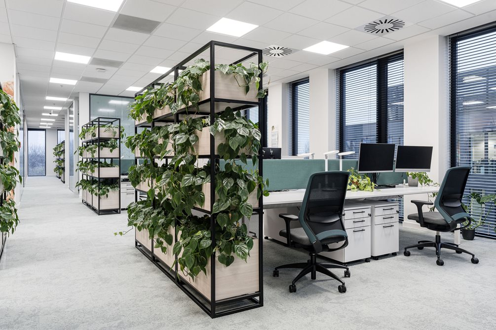 Pracovné miesta sú vybavené stolmi z radu Nexus so stolovými paravánmi Vibe, ako aj kontajnermi a skrinkami z radu Space. Kancelárie pre exekutívu sú zariadené v minimalistickom štýle stolmi z radu Oberon na drevených nohách. Všetky pracovné stanice sú vybavené pohodlnými a ľahkými kancelárskymi stoličkami Esencia so sieťovanou opierkou.